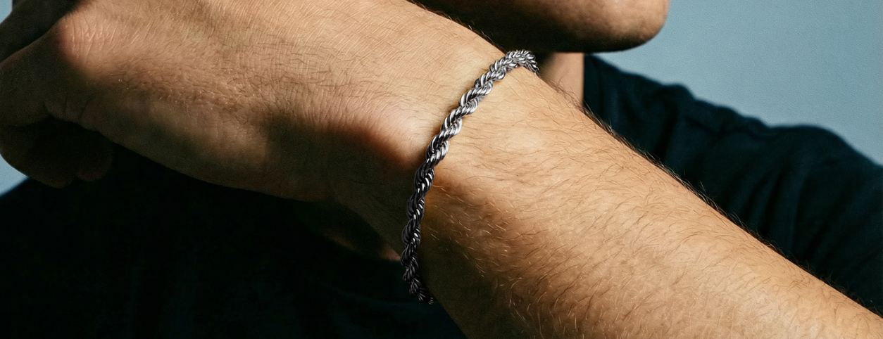 Defined by its rope-inspired weave, this 5mm width bracelet combines texture and strength in a timeless design. Crafted from surgical-grade stainless steel, it’s built for durability and everyday wear. Structured yet fluid on the wrist, it’s an understated essential with a strong presence.
